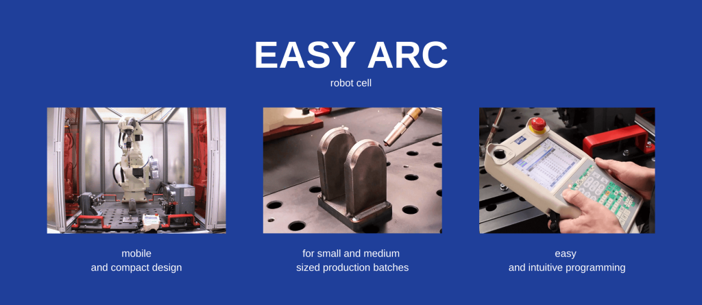 Easy Arc is a mobile robotic welding cell designed for industrial environments and ready for immediate operation. Optimized for small and medium-sized production batches, it enables MIG/MAG welding in combination with a vertical rotary positioner and an OTC FD-BT6 robot.
